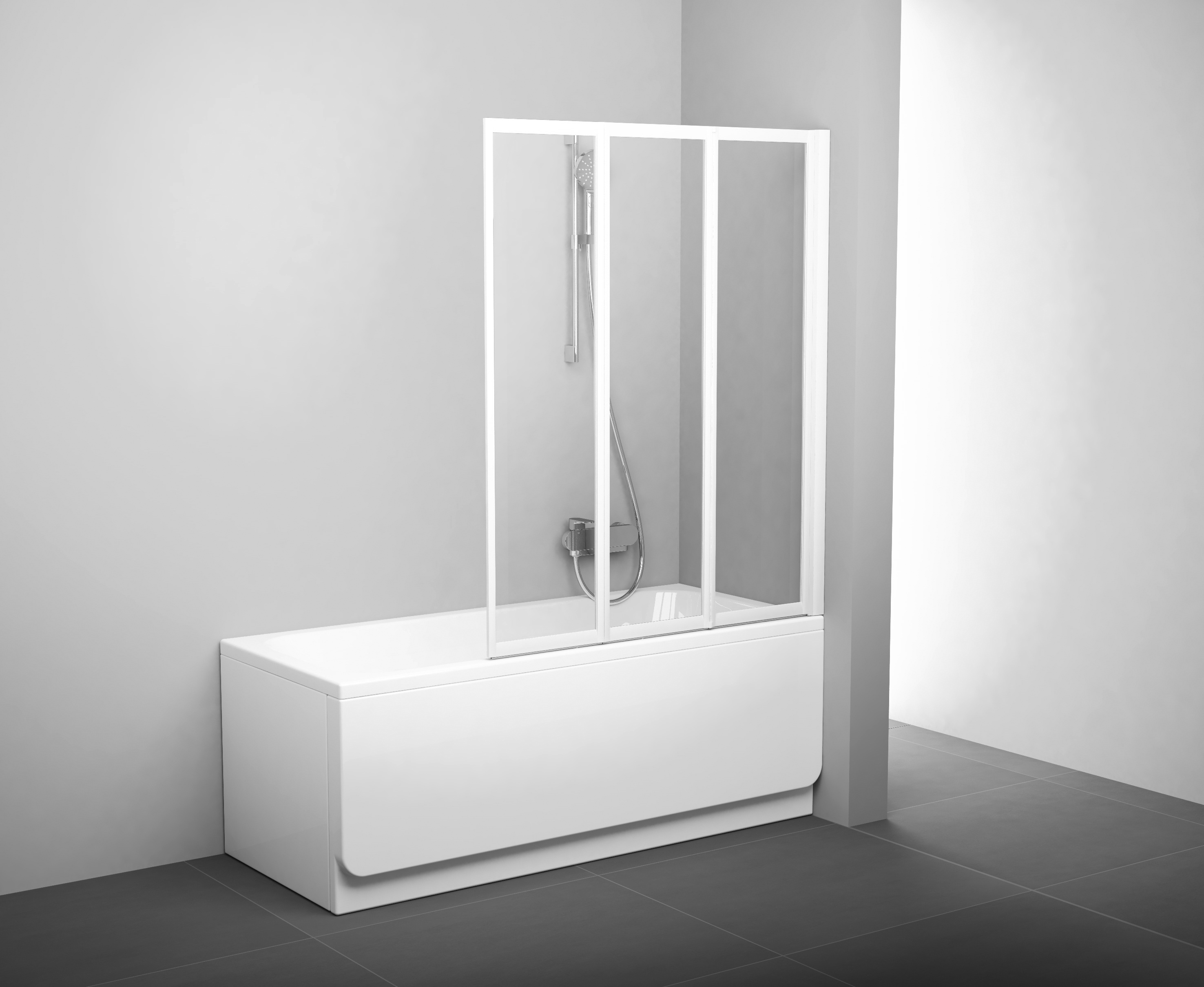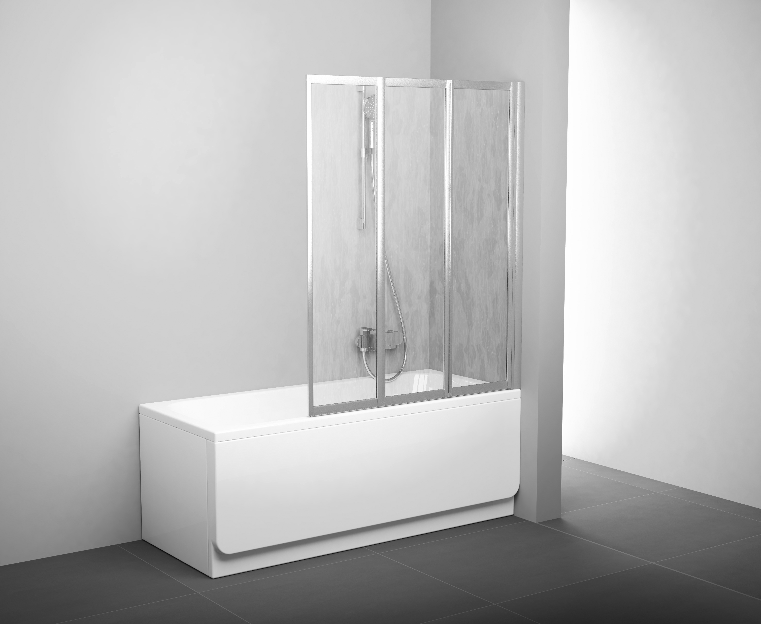 Die Badewannenabtrennung besteht aus drei beweglichen Teilen, welche sich komplett nach innen über der Badewanne zusammenklappen lassen. Die Standardhöhe der Badewannenabtrennung beträgt 1400 mm, die Breite 100 verfügt im zusammengeklappten Zustand über eine Breite von 340 mm, die Breite 115 von 392 mm und die Breite 130 von 444 mm. Die links- bzw. rechtsseitige Einstiegsvariante erhält man, indem man die Badewannenabtrennung um 180° dreht.