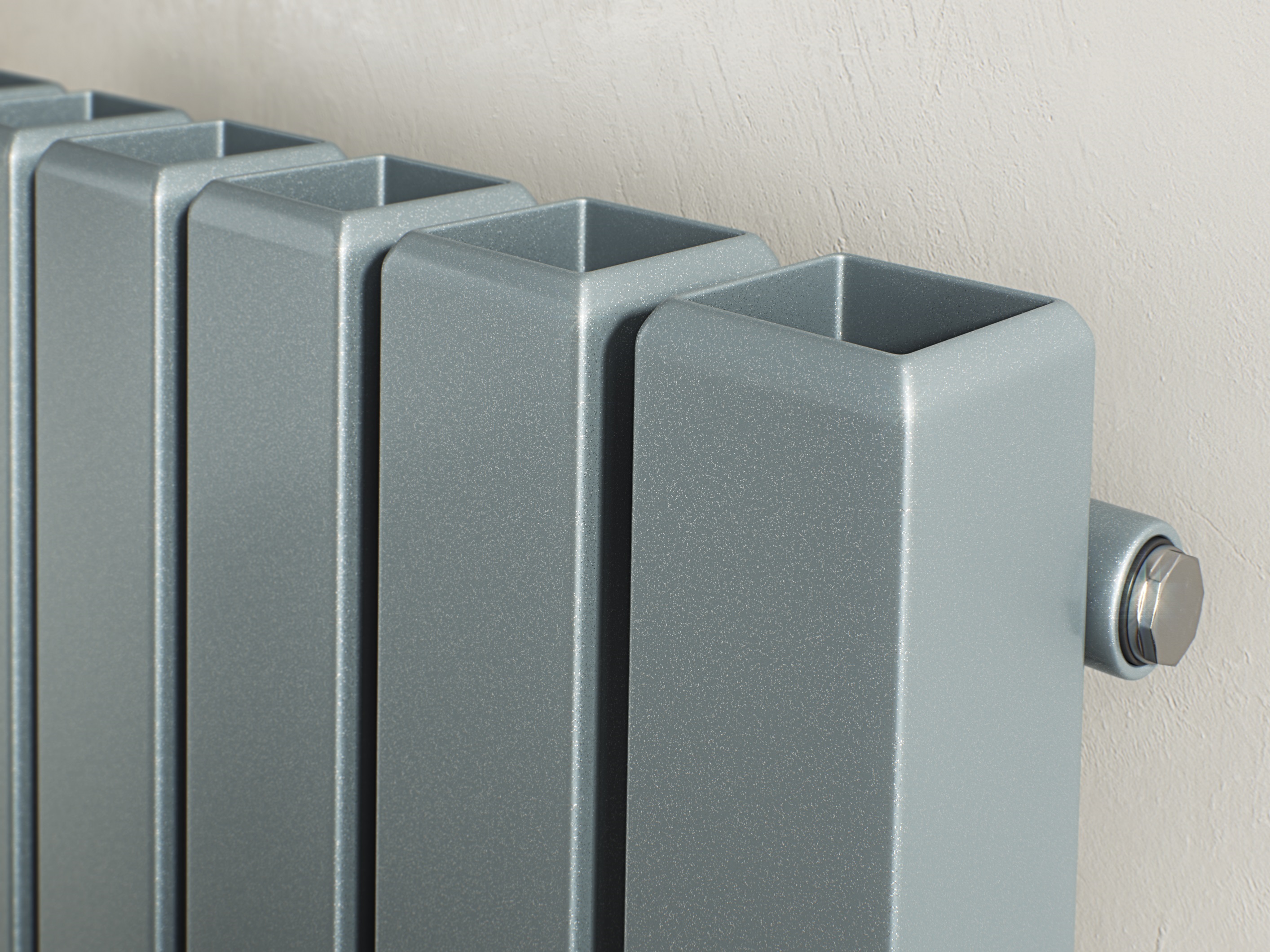 Ausführung: Die Rohrverbindungen sind mittels Speziallötverfahren hartverlötet. Nach der Dichtigkeitsprüfung mit Luft bei einem Druck von 5,2 bar im Wasserbad, werden die Heizkörper phosphatiert und in der Standardfarbe RAL 9003 lösungsmittelfrei mit Epoxi – Polyester – Pulver gemäß DIN 55900 elektrostatisch beschichtet und eingebrannt.