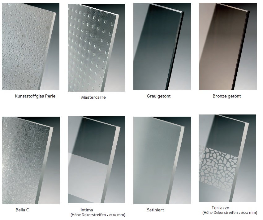 - Glasvarianten: Bella, Satiniert, Grau getönt, Intima, Terrazzo, Bronze getönt, Terrazzo: Mehrpreis 320,00 EUR inkl. MwSt.